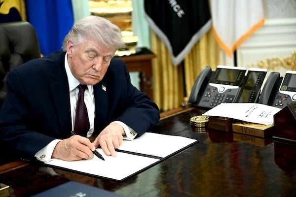 President Donald Trump signs an executive order in the Oval Office of the White House on March 31, 2026. (Brendan Smialowski/AFP via Getty Images) |