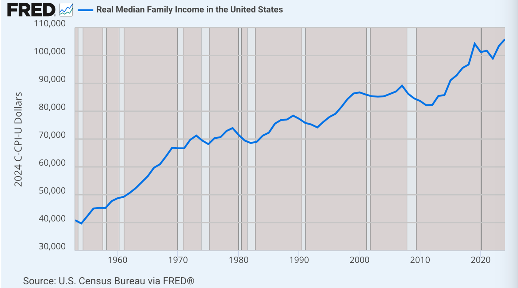 Here is where matters don’t look good at all. From 1984 to 2024, real median household income rose 40 percent. But during these years, it became more typical than not that a single household would have two income streams (at least) rather than just one.