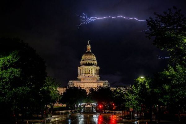 Lightning flashes behind the Texas State Capitol in Austin on April 27, 2023. (Brandon Bell/Getty Images) |