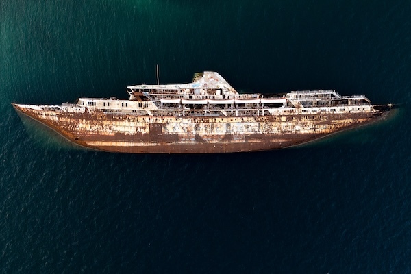 An aerial photograph shows the MS Mediterranean Sky, an abandoned cruise ship on the coast of Gulf of Elefsina, west of Athens, on Aug. 4, 2025. (Angelos Tzortzinis/AFP via Getty Images) |
