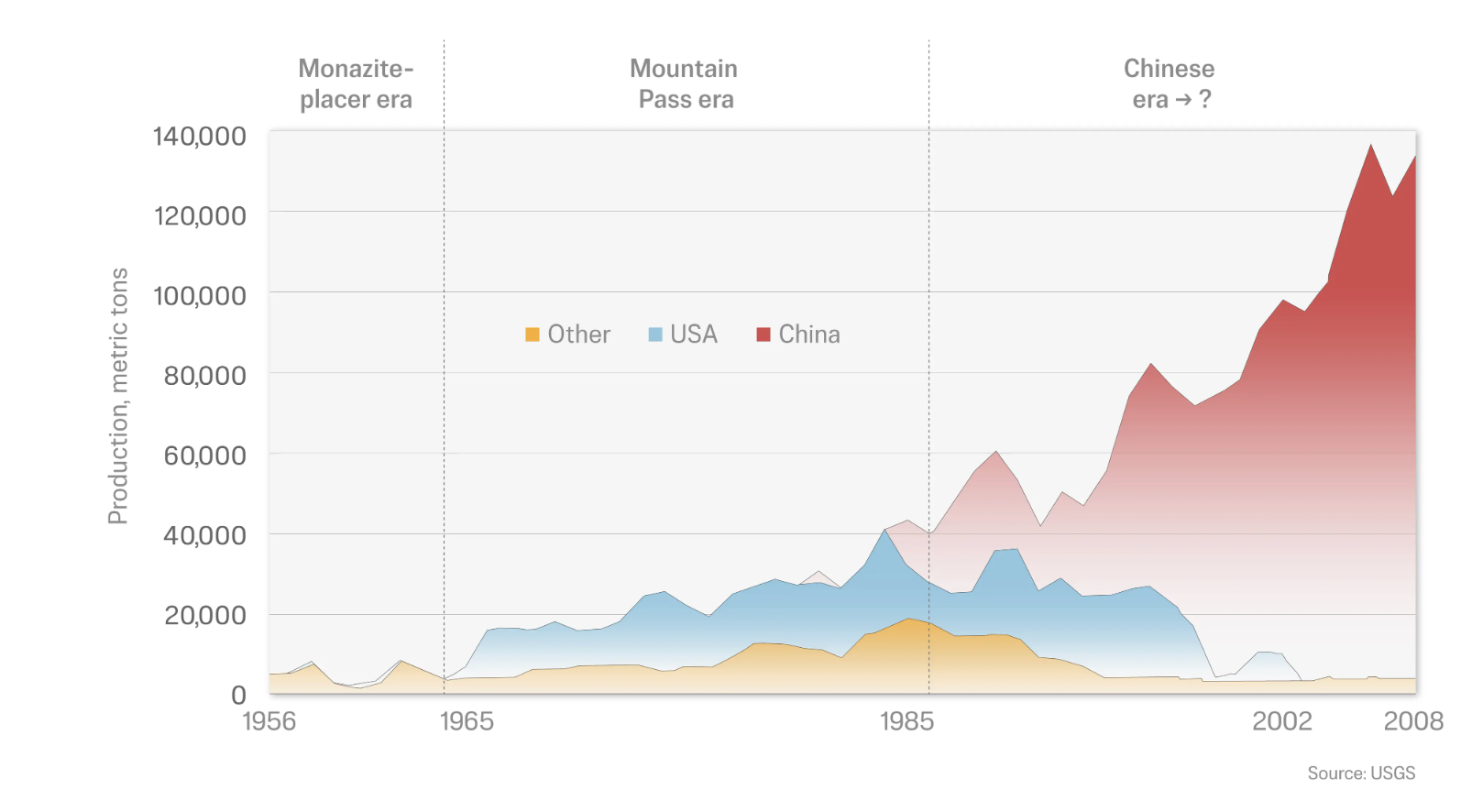 A chart shows rare-earth element production between 1956 and 2008, based on data from the U.S. Geological Survey. Illustration by The Epoch Times |