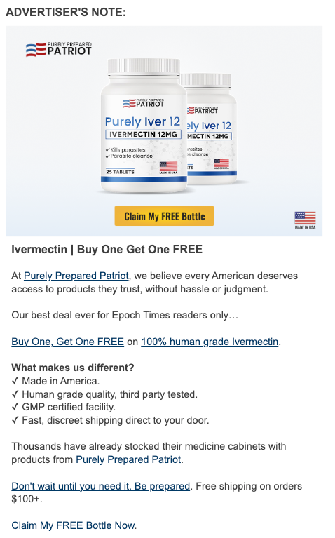 (Sponsored) US Ivermectin: Buy One Get One FREE. 100% American made Human grade. Thousands of Americans trust Purely Prepared Patriot. Stock up now. Don't wait until you need it. Be prepared. Free shipping $100+. Get Your FREE Bottle →